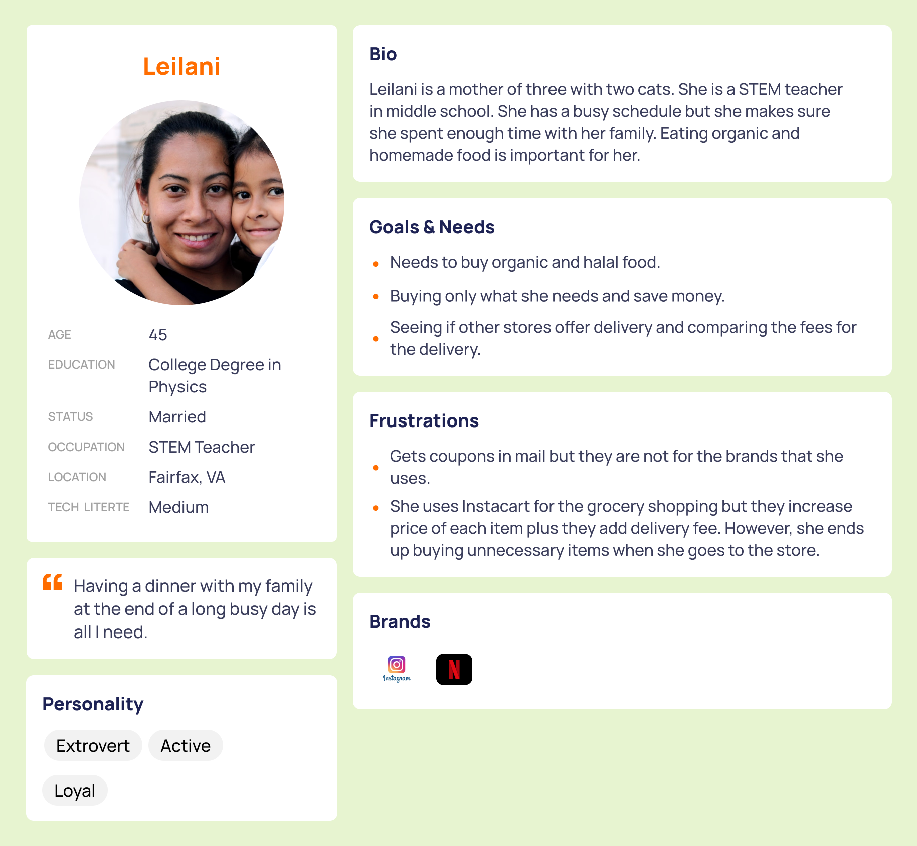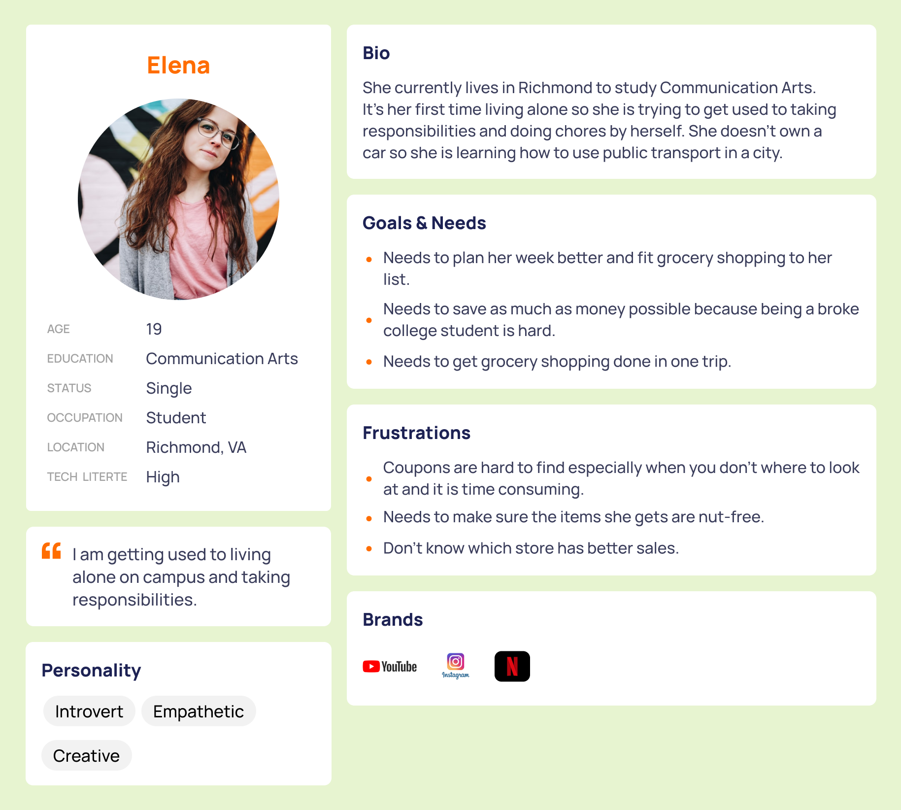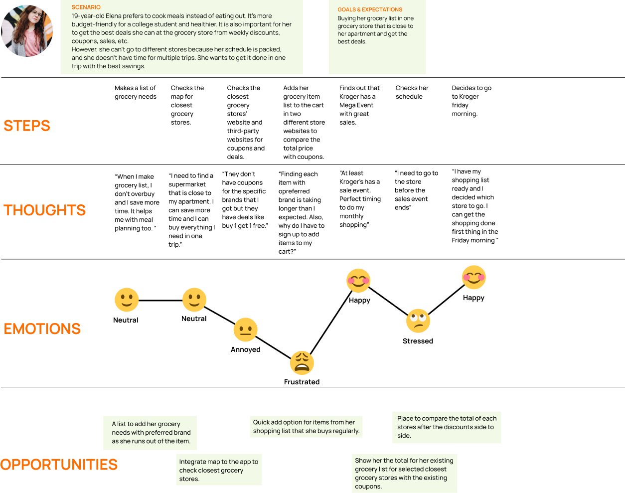 "19-year-old Elena prefers to cook meals instead of eating out. It's a healthier and more budget-friendly option for a college student. It is also important for her to get the best deals at the grocery store like weekly discounts, coupons, sales, etc. However, she can't go to different stores because her schedule is packed, and she doesn't have time for multiple trips. She wants to get it done in one trip with the best savings."